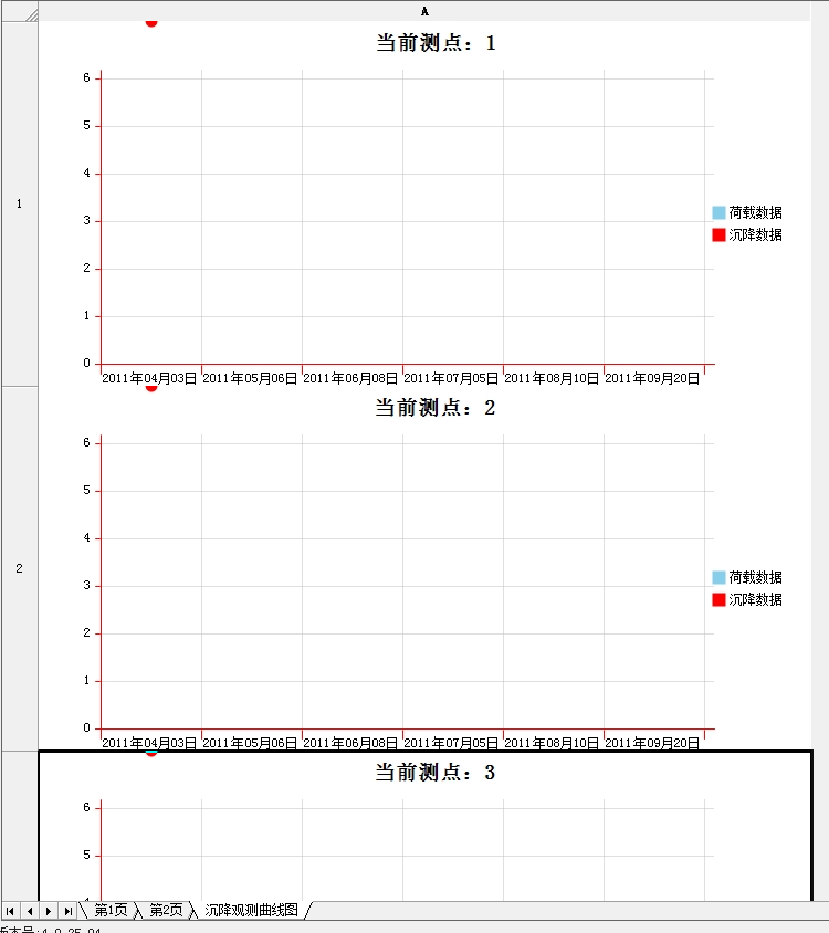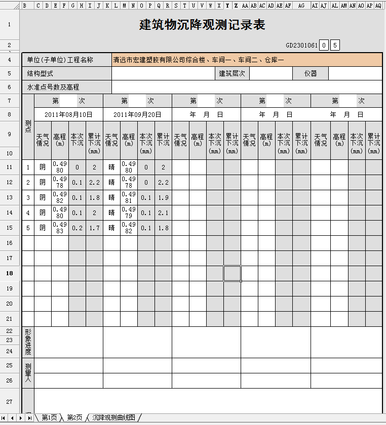 新建表格建筑物沉降觀測記錄時,需按要求填寫量測點(diǎn)數(shù)、量測次數(shù),然后開始記錄數(shù)值,這樣才能生成沉降觀測曲線圖