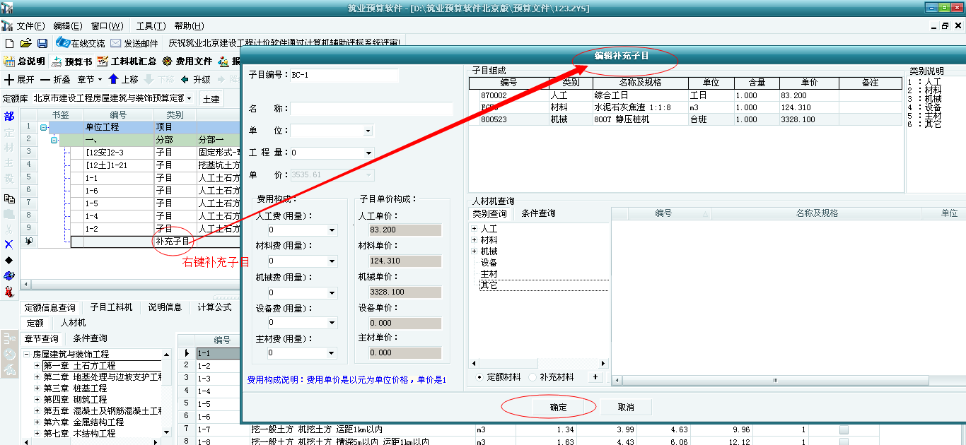 在子目上右鍵—補(bǔ)充內(nèi)容---補(bǔ)充子目,然后填寫(xiě)補(bǔ)充子目?jī)?nèi)容如下圖所示: