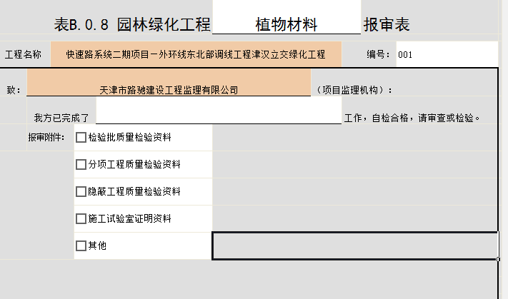 此表適合報審驗(yàn)收資料:根據(jù)你需要報審的內(nèi)容選擇附件,比如是檢驗(yàn)批,上面就寫某樹種某區(qū)域栽植土及種植穴檢驗(yàn)批、某樹種某區(qū)域新植養(yǎng)護(hù)檢驗(yàn)批等;如果附件是分項(xiàng),必須就寫苗木種植工程新植養(yǎng)護(hù)分項(xiàng)。。。。。。也可以根據(jù)當(dāng)?shù)乇O(jiān)理要求寫,供參考。