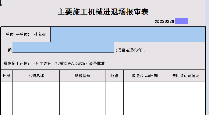 你好,只找到了001-A13 進(jìn)場(chǎng)施工機(jī)具報(bào)審表,001-24、統(tǒng)表C01-24主要施工機(jī)械、設(shè)備報(bào)審表這2個(gè)表。就是沒(méi)出場(chǎng)日期了,只需要填寫(xiě)進(jìn)場(chǎng)日期了。建議如果監(jiān)理要求用舊表就從舊軟件里借用這個(gè)表。