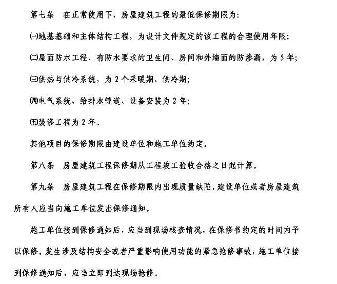 您好!關(guān)于保修期的規(guī)范建設(shè)部的規(guī)定見圖片。最好也查一下當(dāng)?shù)氐慕ㄎ囊?guī)定。