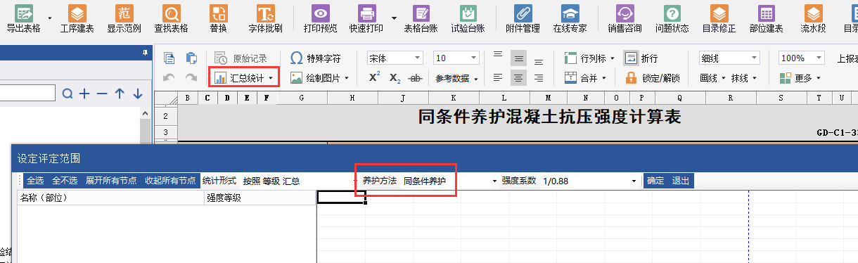 填寫完C1-332以后填寫C1-334,單擊匯總統(tǒng)計,會彈出一個窗口養(yǎng)護方法內(nèi)可以選擇同條件養(yǎng)護