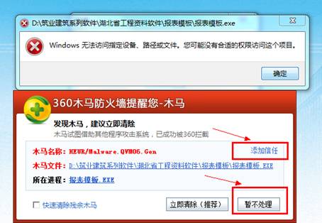 點擊“添加信任”按紐,然后選擇“暫不處理”按紐,再重新安裝軟件就可以了。程序模板安裝自動加到信任列表,如下圖: