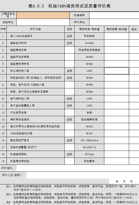 機(jī)組168H滿負(fù)荷試運(yùn)質(zhì)量評(píng)價(jià)表