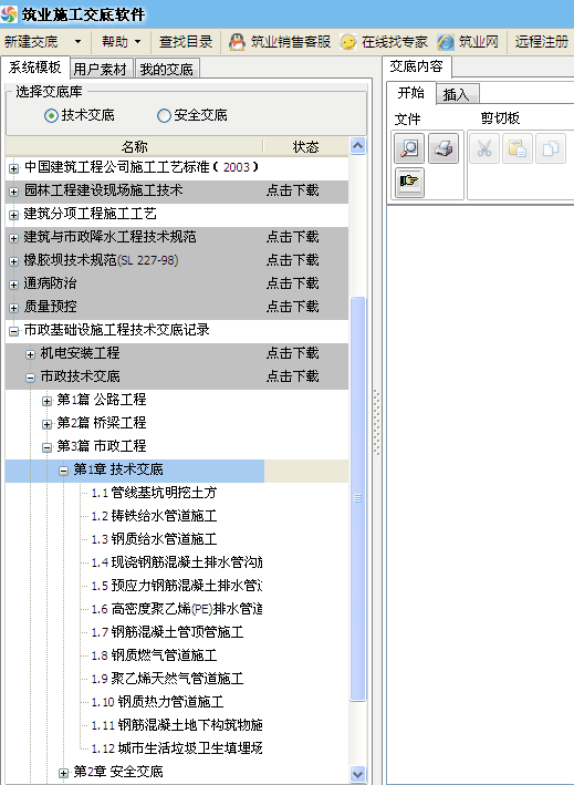 我買的是市政資料軟件,但安裝后沒有市政基礎(chǔ)設(shè)施工程技術(shù)交底內(nèi)容,只有建筑安裝分項工程施工工藝規(guī)程。誰可以幫我解答下怎么解決啊,我要市政基礎(chǔ)設(shè)施工程技術(shù)交底的內(nèi)容。。。