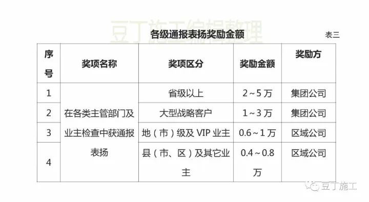 在各級主管部門或業(yè)主的質(zhì)量安全大檢查中獲通報(bào)表揚(yáng)的項(xiàng)目部,根據(jù)影響情況按“表三”對項(xiàng)目部給予不同的獎勵。檢查有排名的,只對前三名進(jìn)行獎勵,一年多次受同一部門、同一事由表揚(yáng)的,只獎勵一次。