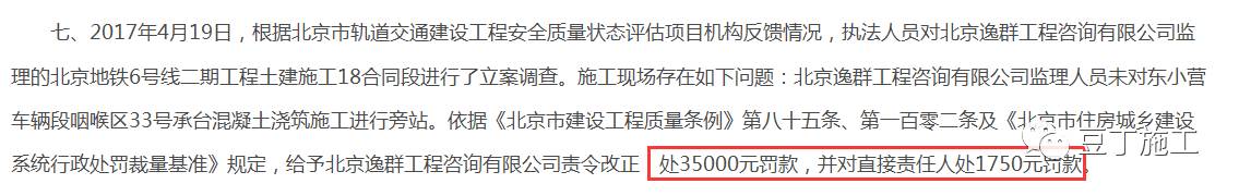 2017年4月19日,根據(jù)北京市軌道交通建設(shè)工程安全質(zhì)量狀態(tài)評估項目機(jī)構(gòu)反饋情況,執(zhí)法人員對北京逸群工程咨詢有限公司監(jiān)理的北京地鐵6號線二期工程土建施工18合同段進(jìn)行了立案調(diào)查。施工現(xiàn)場存在如下問題:北京逸群工程咨詢有限公司監(jiān)理人員未對東小營車輛段咽喉區(qū)33號承臺混凝土澆筑施工進(jìn)行旁站。依據(jù)《北京市建設(shè)工程質(zhì)量條例》第八十五條、第一百零二條及《北京市住房城鄉(xiāng)建設(shè)系統(tǒng)行政處罰裁量基準(zhǔn)》規(guī)定,給予北京逸群工程咨詢有限公司責(zé)令改正,處35000元罰款,并對直接責(zé)任人處1750元罰款。