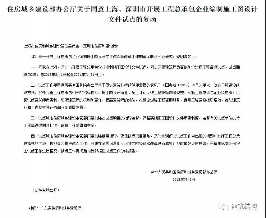一、同意在上海、深圳市開展工程總承包企業(yè)編制施工圖設(shè)計(jì)文件試點(diǎn),同步開展建筑師負(fù)責(zé)制和全過程工程咨詢?cè)圏c(diǎn)。試點(diǎn)期限為3年,自2018年8月1日起至2021年7月31日止。