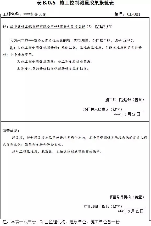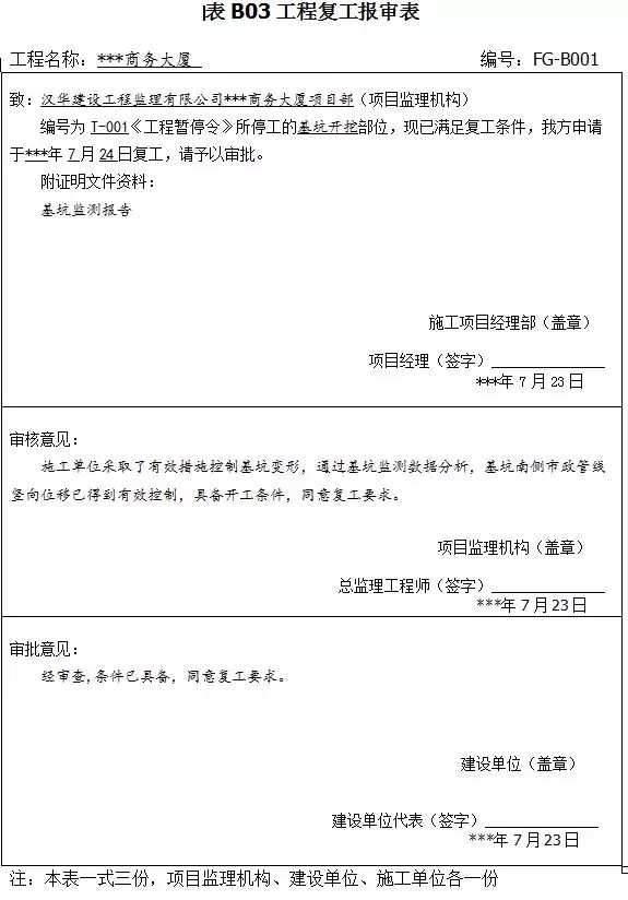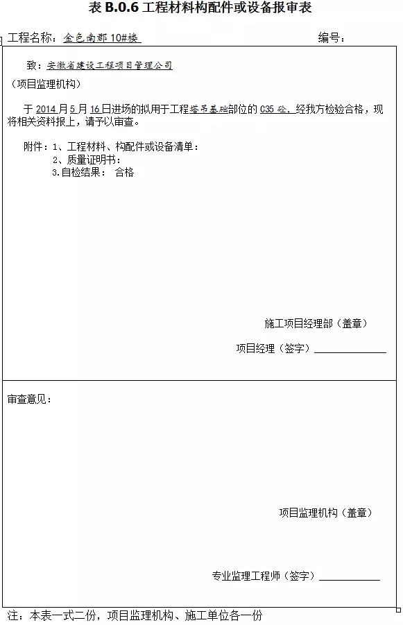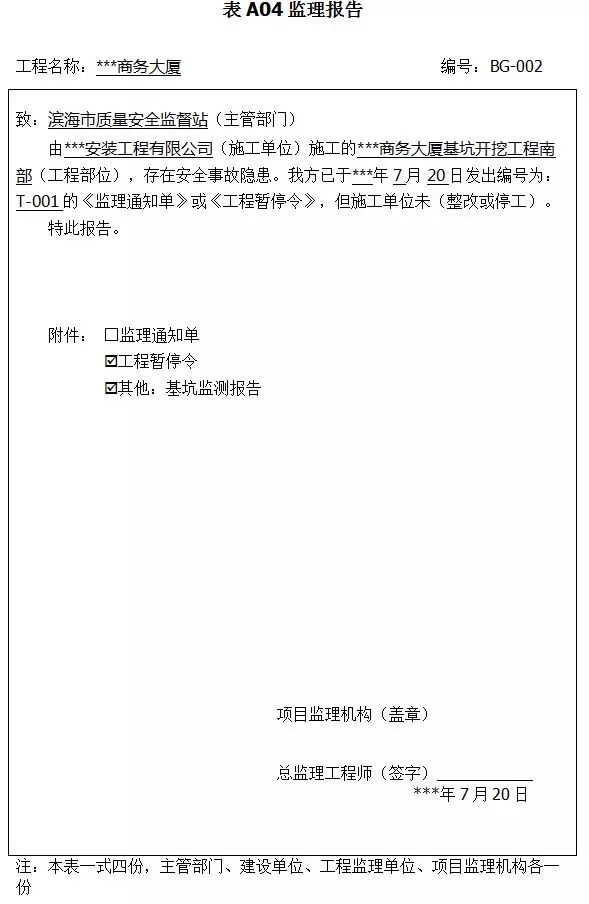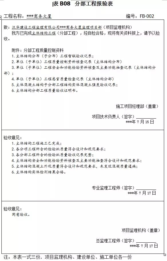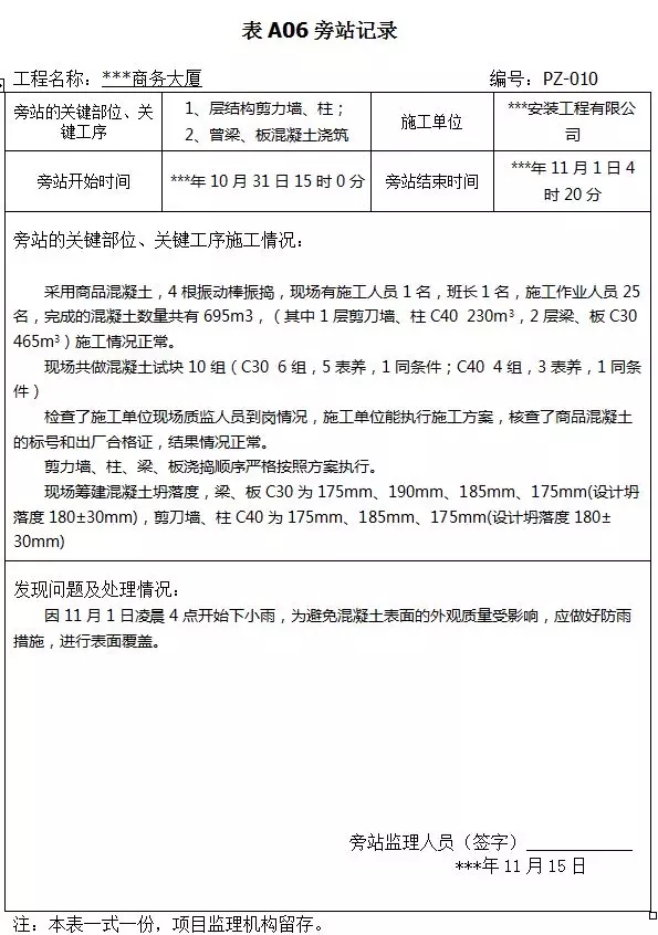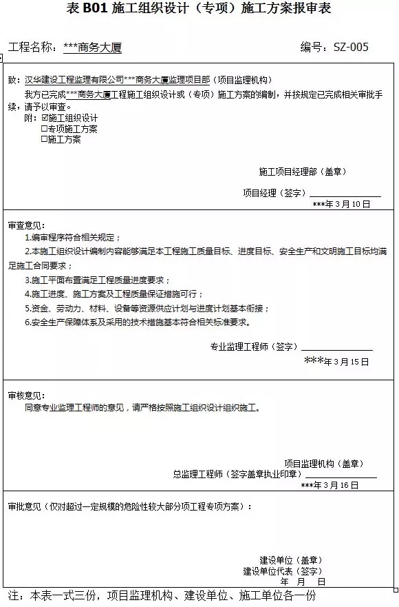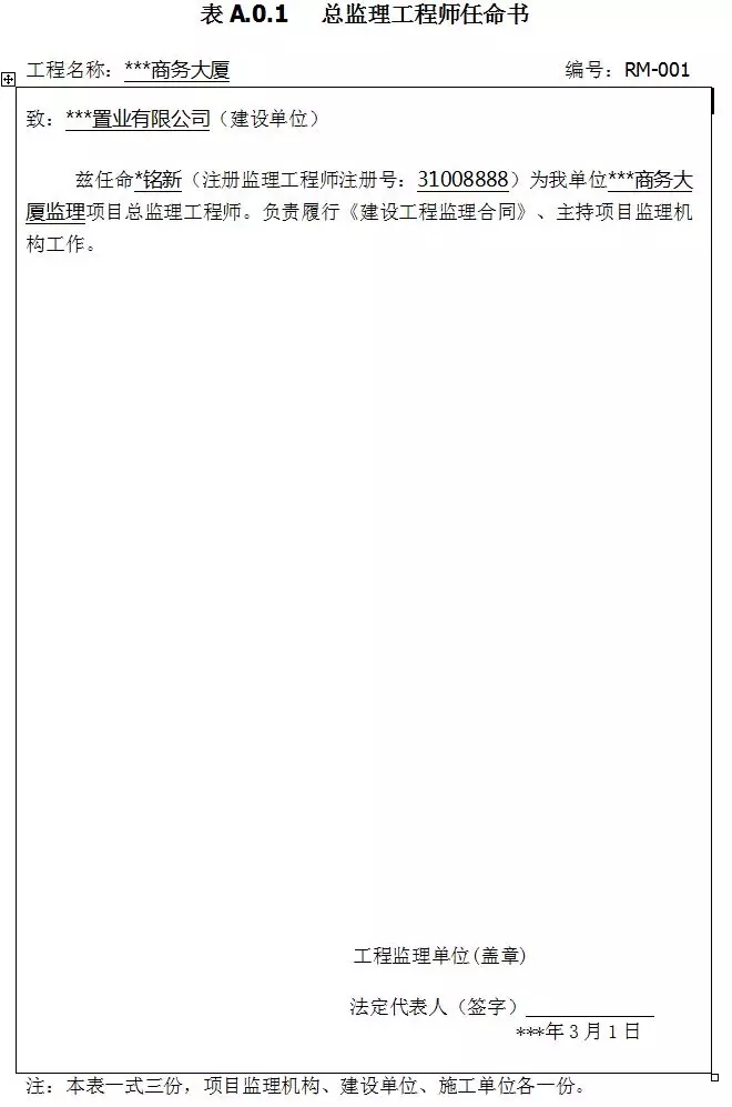 建設(shè)工程監(jiān)理規(guī)范(GB/T50319-2013) 表格填寫范例 建設(shè)工程監(jiān)理規(guī)范(GB/T50319-2013)自2014年3月1日起實(shí)施,原建設(shè)工程監(jiān)理規(guī)范(GB50319-2000)同時(shí)廢止。 新規(guī)范與原規(guī)范在表格上作了較大調(diào)整: 1、基本表式分A、B、C三類。原規(guī)范A類表為施工單位用表,B樓表為監(jiān)理單位用表,C類表為通用表;新規(guī)范A類表為監(jiān)理單位用表,B類表為施工單位用表,C類表為通用表。 2、原規(guī)范監(jiān)理單位用表6個(gè),施工單位用表10個(gè),通用表2個(gè);新規(guī)范監(jiān)理單位用表8個(gè),施工單位用表14個(gè),通用表3個(gè)。 3、新規(guī)范表格在制作內(nèi)容上比原規(guī)范表格更加嚴(yán)謹(jǐn),更加規(guī)范。 (1)部分表格增加了建設(shè)單位簽字欄; (2)不同內(nèi)容的表格對不同的簽字人、蓋不同的章均作了明確規(guī)定; (3)每種表格規(guī)定了制作的份數(shù)和存放單位。 4、新規(guī)范對按規(guī)定的表格填寫以單列條文的形式進(jìn)行規(guī)定,體現(xiàn)了使用規(guī)范附錄規(guī)定的表式的效力性。