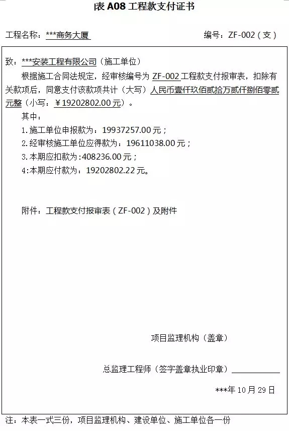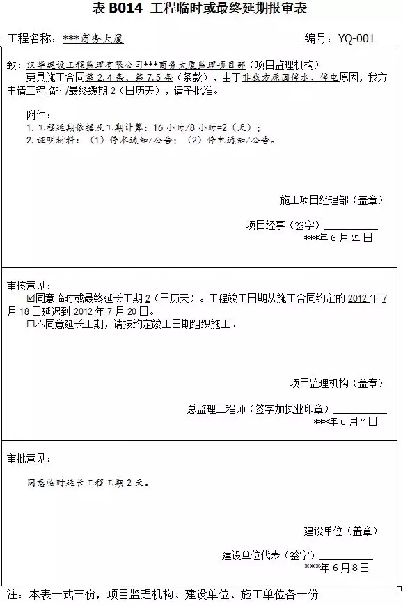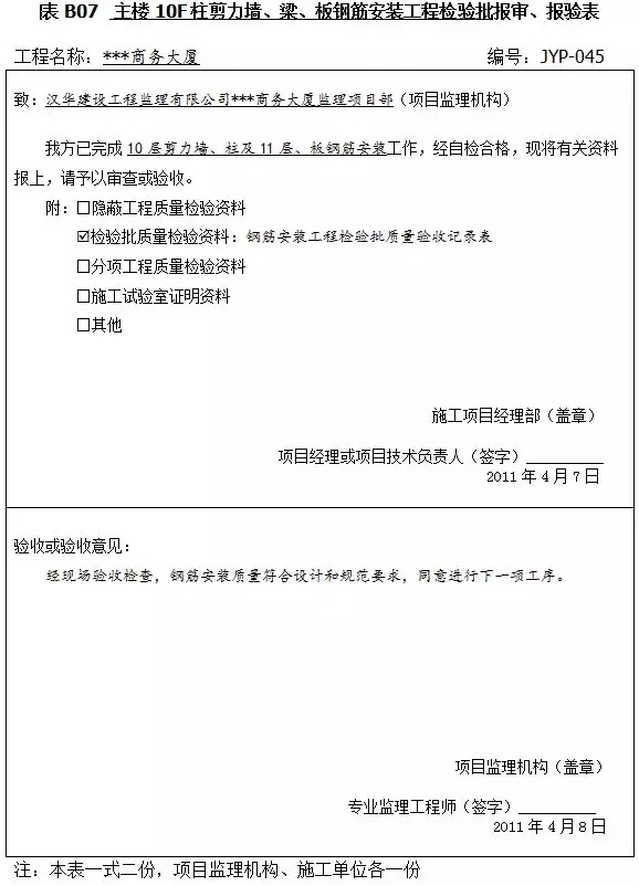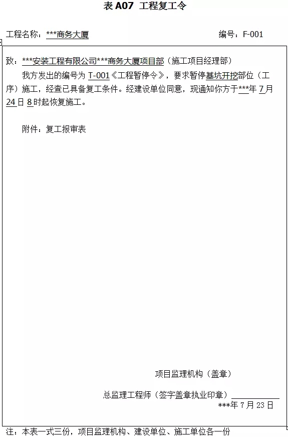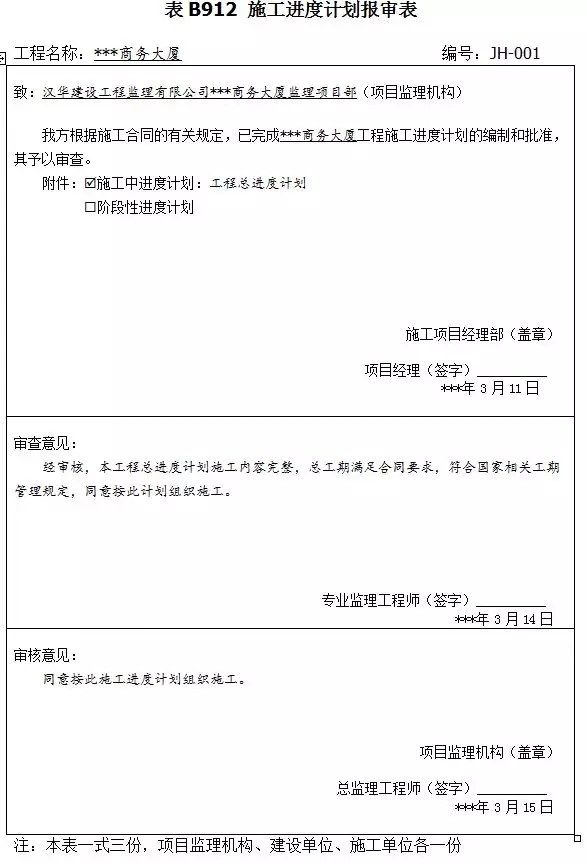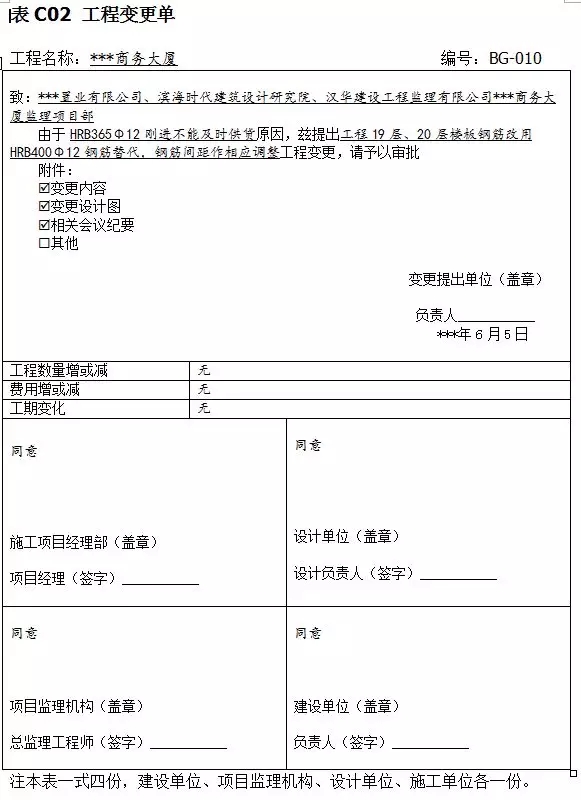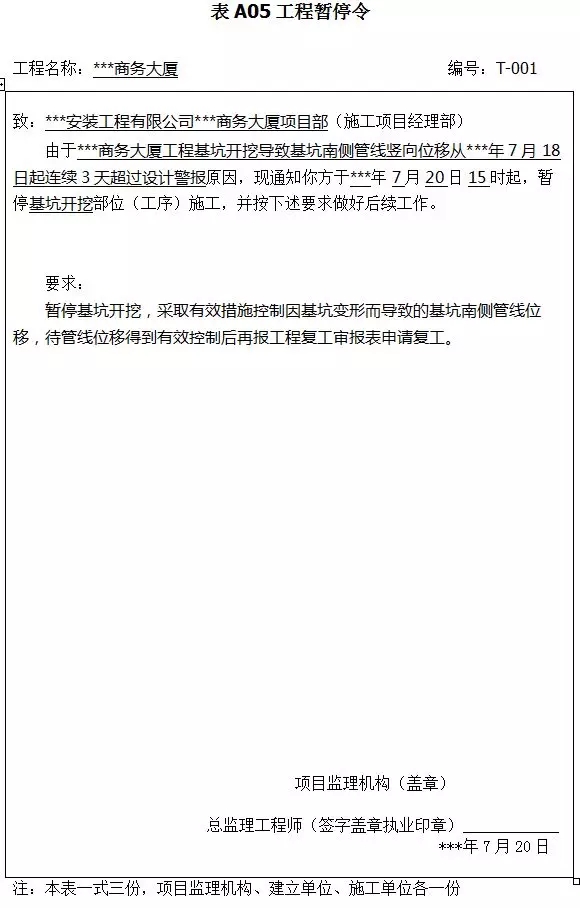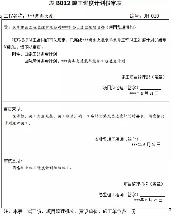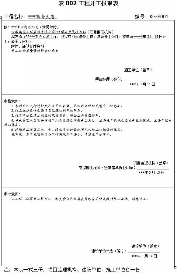 建設(shè)工程監(jiān)理規(guī)范(GB/T50319-2013) 表格填寫范例 建設(shè)工程監(jiān)理規(guī)范(GB/T50319-2013)自2014年3月1日起實(shí)施,原建設(shè)工程監(jiān)理規(guī)范(GB50319-2000)同時(shí)廢止。 新規(guī)范與原規(guī)范在表格上作了較大調(diào)整: 1、基本表式分A、B、C三類。原規(guī)范A類表為施工單位用表,B樓表為監(jiān)理單位用表,C類表為通用表;新規(guī)范A類表為監(jiān)理單位用表,B類表為施工單位用表,C類表為通用表。 2、原規(guī)范監(jiān)理單位用表6個(gè),施工單位用表10個(gè),通用表2個(gè);新規(guī)范監(jiān)理單位用表8個(gè),施工單位用表14個(gè),通用表3個(gè)。 3、新規(guī)范表格在制作內(nèi)容上比原規(guī)范表格更加嚴(yán)謹(jǐn),更加規(guī)范。 (1)部分表格增加了建設(shè)單位簽字欄; (2)不同內(nèi)容的表格對不同的簽字人、蓋不同的章均作了明確規(guī)定; (3)每種表格規(guī)定了制作的份數(shù)和存放單位。 4、新規(guī)范對按規(guī)定的表格填寫以單列條文的形式進(jìn)行規(guī)定,體現(xiàn)了使用規(guī)范附錄規(guī)定的表式的效力性。