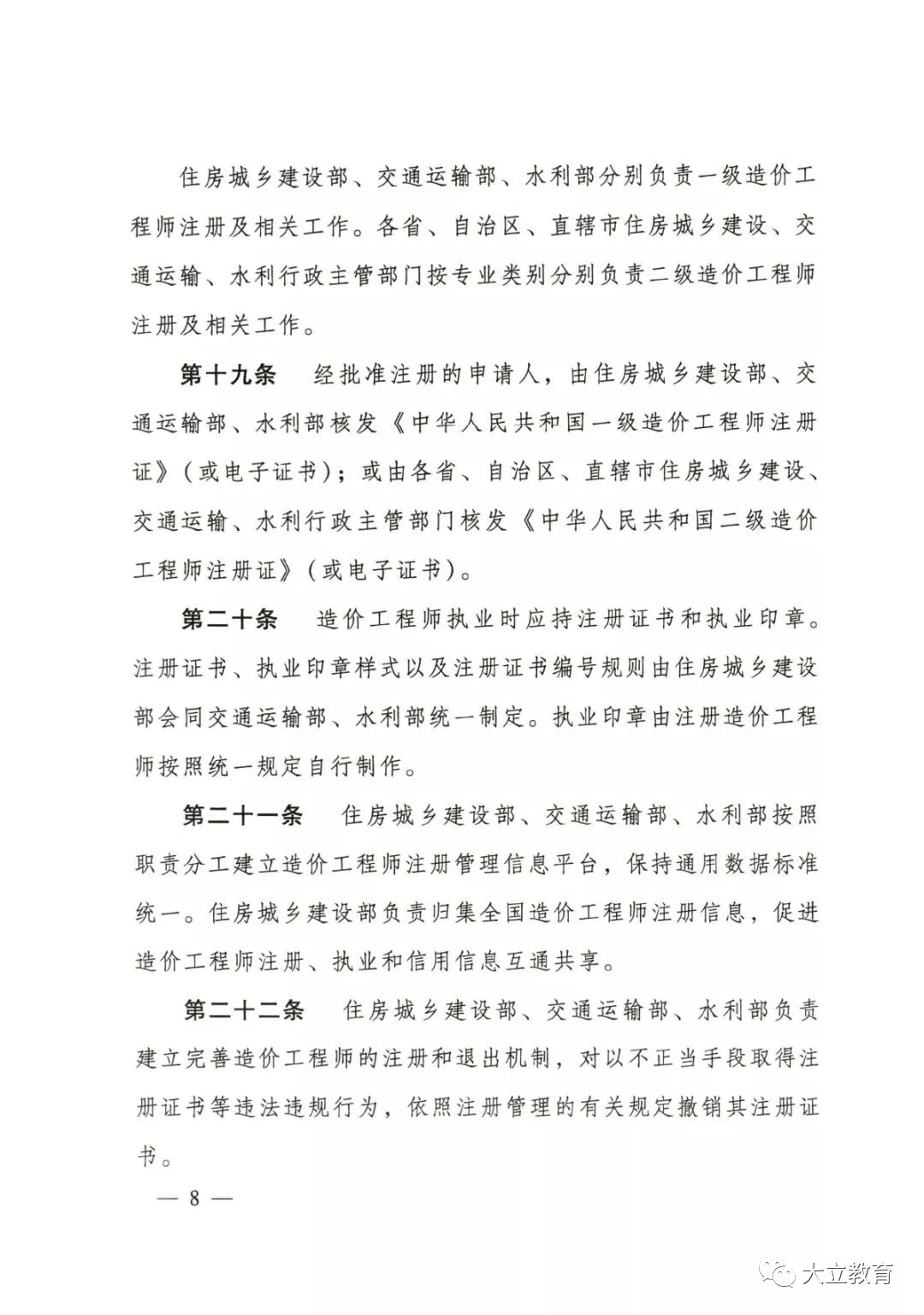 各省、自治區(qū)、直轄市住房城鄉(xiāng)建設(shè)、交通運(yùn)輸、水利行政主管部門(mén)按專(zhuān)業(yè)類(lèi)別分別負(fù)責(zé)二級(jí)造價(jià)工程師注冊(cè)及相關(guān)工作。