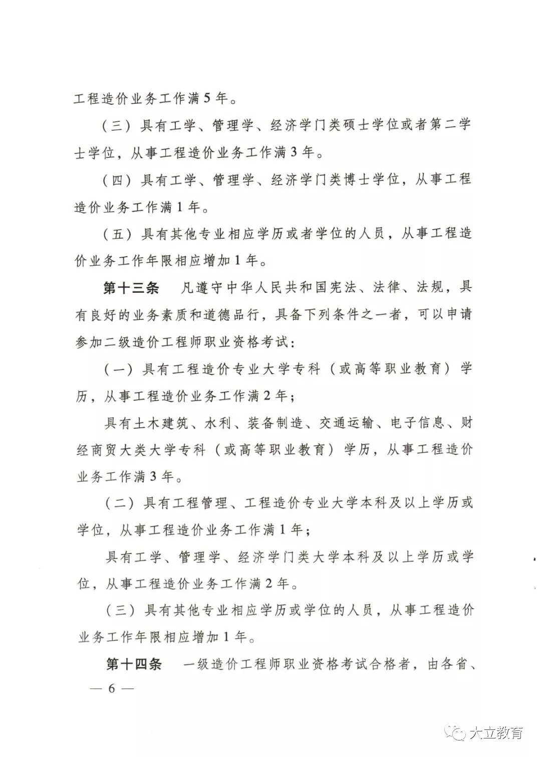 具有土木建筑、水利、裝備制造、交通運(yùn)輸、電子信息、財(cái)經(jīng)商貿(mào)大類(lèi)大學(xué)專(zhuān)科(或高等職業(yè)教育)學(xué)歷,從事工程造價(jià)業(yè)務(wù)工作滿6年。