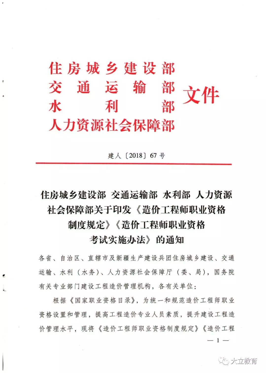 住房城鄉(xiāng)建設(shè)部 交通運(yùn)輸部 水利部 人力資源社會(huì)保障部于今日印發(fā)《造價(jià)工程師職業(yè)資格制度規(guī)定》《造價(jià)工程師職業(yè)資格考試辦法》的通知(建人〔2018〕67號(hào))。