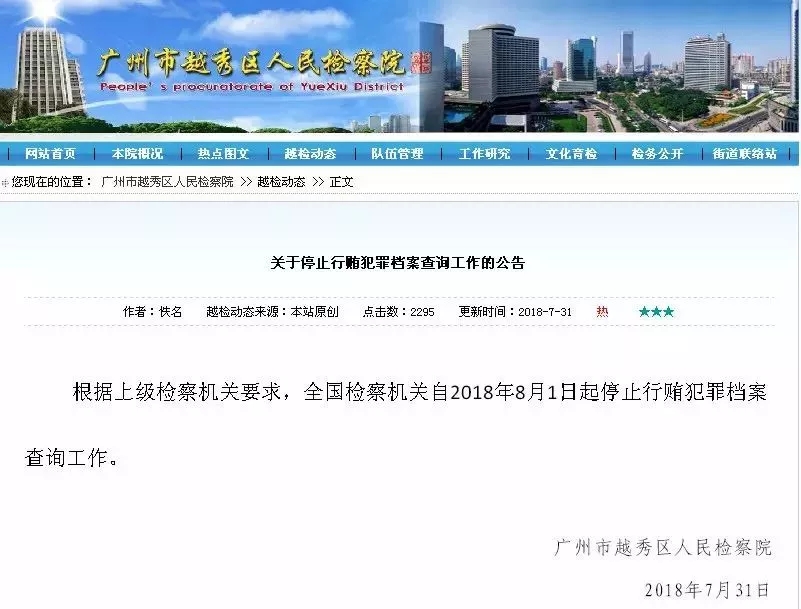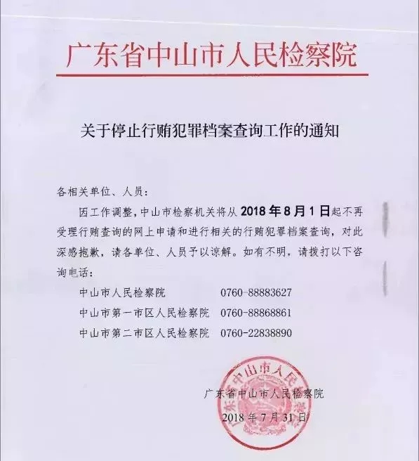 按照中山市檢察院《關(guān)于停止行賄犯罪檔案查詢工作的通知》,市檢察院將從2018年8月1日起不再受理行賄查詢的網(wǎng)上申請(qǐng)和進(jìn)行相關(guān)的行賄犯罪檔案查詢。經(jīng)研究,現(xiàn)將相關(guān)事宜通知如下: