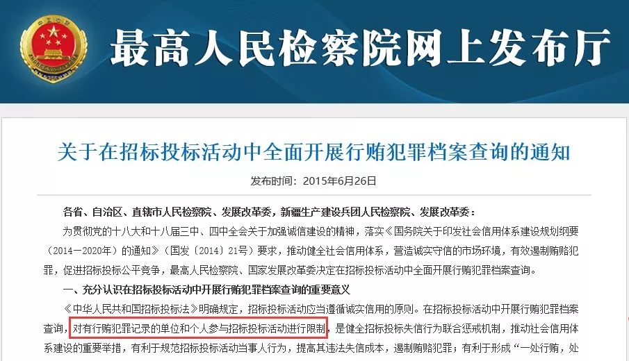2015年6月26日,最高人民檢察院發(fā)布《關(guān)于在招標(biāo)投標(biāo)活動(dòng)中全面開展行賄犯罪檔案查詢的通知》。